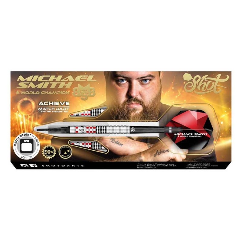 Le freccette soft Michael Smith Achieve nascono dalla collaborazione delle aziende Shot (NZ) e il campione del mondo di freccette Michael "Bully Boy" Smith (queste sono le stesse freccette che lui utilizza in gara e che vedete in TV) e sono state progettate secondo i requisiti definiti da Bully Boy.