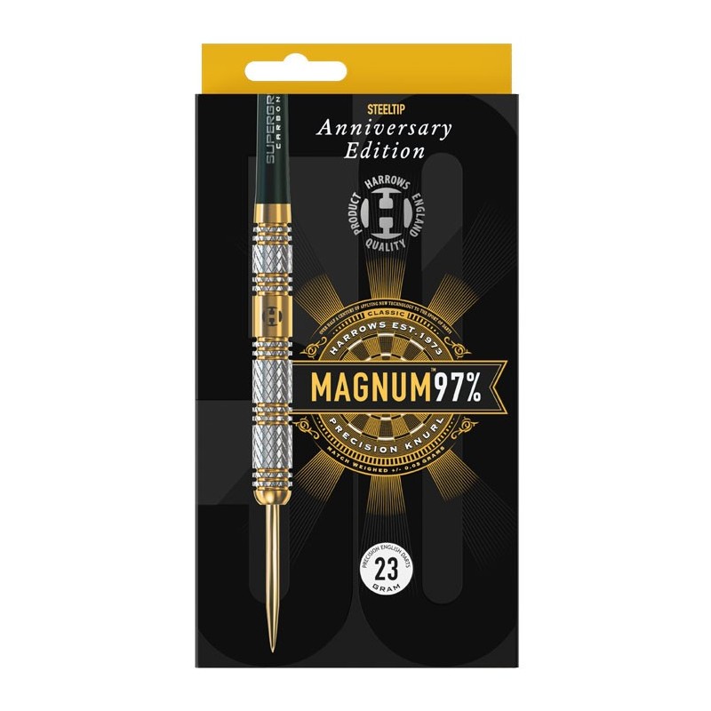 Le freccette Magnum 97% Anniversary sono ad oggi le freccette con la più alta percentuale di tungsteno mai offerta da Harrows: il 97% appunto. Presentano una combinazione di sezioni zigrinate e lisce hanno reso questo corpo sottile e cilindrico una scelta popolare tra molti giocatori.